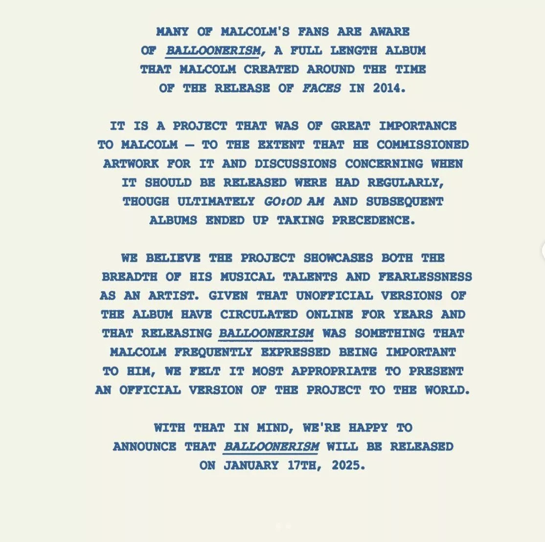 Neither did it seem to reach his label Warner Music Group. When reached out for comment, I was referred to Mac’s publicist: “The discussions about releasing Balloonerism started prior to Mac’s business relationship with Warner. No timeline for the project’s release was ever settled on prior to his passing, though his original intention was to have this closely follow Faces”.